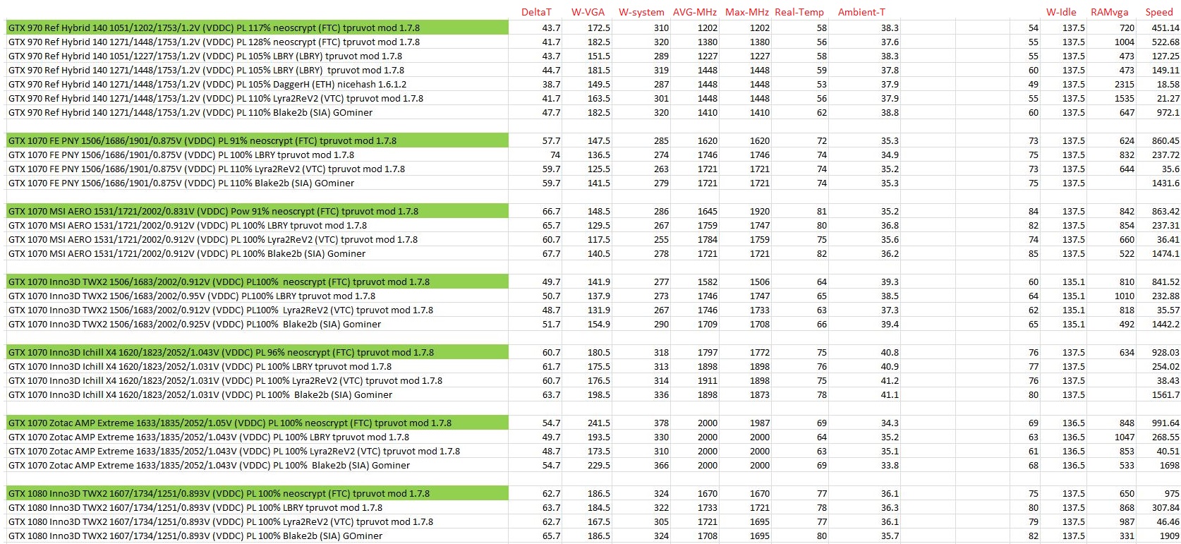 The following tabs includes also the speed with the algos (LBRY, Neoscrypt, Lyra2Rev2 and Blake2b), and the power consumption with the specific setting: